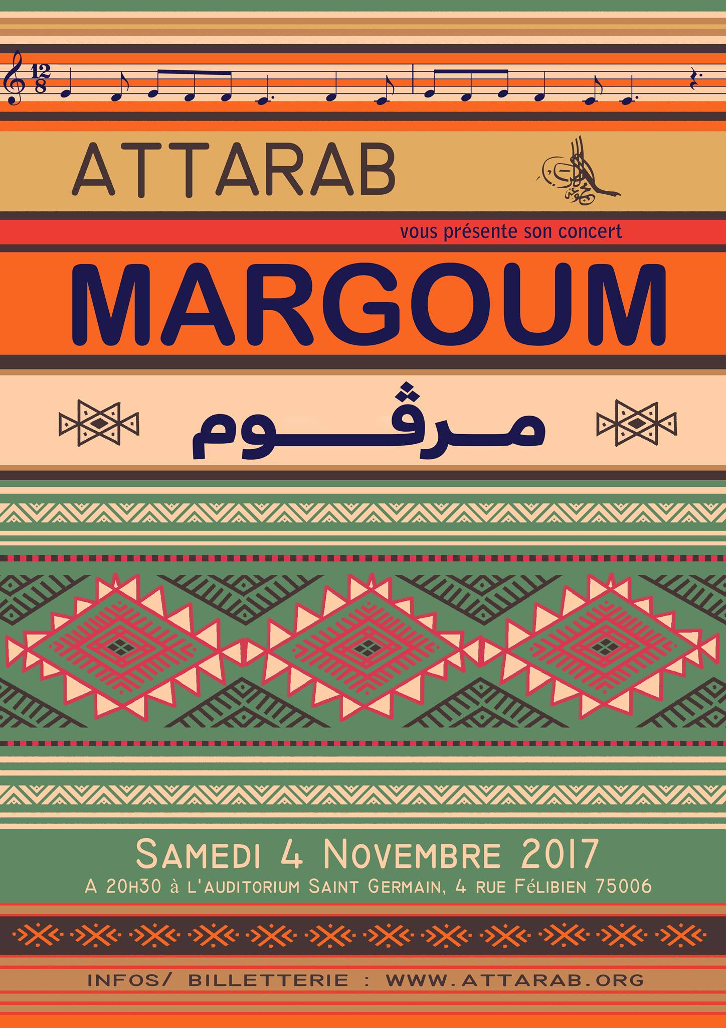 Attarab revient sur scène pour vous présenter un concert inédit. «Margoum مرڤوم”, ce tapis typique et si fameux par ses motifs et couleurs, a inspiré ce rendez-vous artistique qui se veut un voyage authentique au plus profond de la tradition populaire du patrimoine musical tunisien. Terre de métissage depuis la nuit des Temps, la Tunisie regorge de trésors musicaux imprégnés des cultures et spécificités régionales. Du nord au centre, en passant par le Sahel, sans oublier le sud et tant d’autres perles, notre Margoum musical se tissera entre Nouba, airs de montagnes, sons de zokra, chants de mariages, chants populaires, impulsion de Tbal… Attarab est heureux de partager avec vous cette nouvelle page artistique et vous convie chaleureusement à l’inauguration de la saison 17-18.