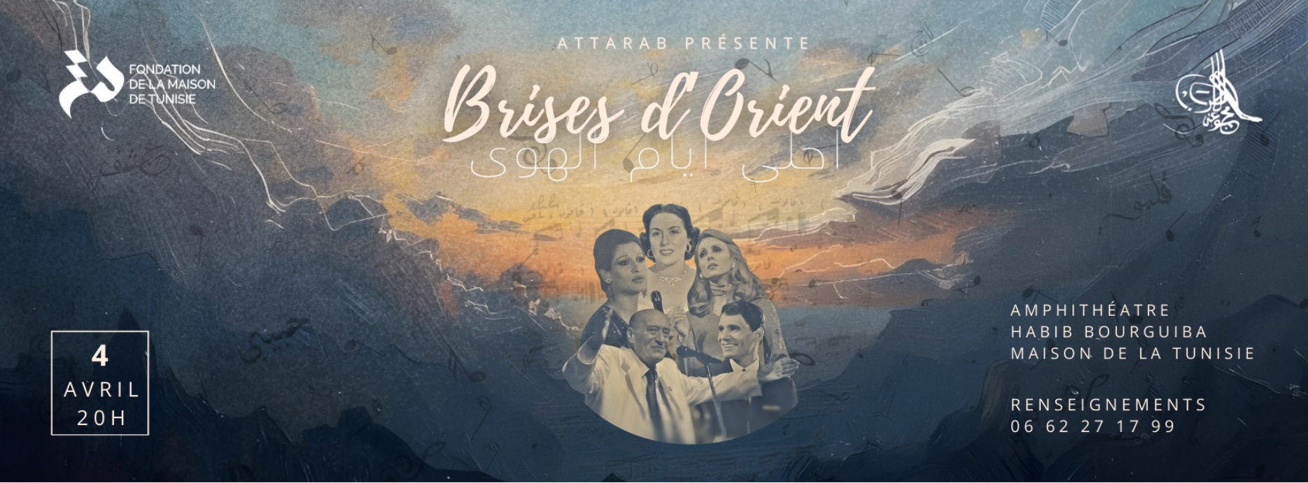 Brise ; souffle léger, presque imperceptible, qui traverse l’air et réveille les souvenirs enfouis. Elle passe, elle caresse, elle emporte avec elle des émotions que l’on croyait oubliées. « Brises d’Orient » vous invite, le temps d’une soirée, à vivre ce souffle et à parcourir la richesse des grandes chansons d’amour du monde arabe. Des mélodies intemporelles, chargées de nostalgie, de désir et de douceur, portées par des voix et des instruments qui racontent l’amour dans toute sa profondeur.